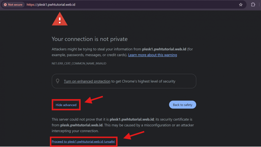 Jika muncul peringatan keamanan browser, pastikan sertifikat SSL Plesk valid atau klik “Advance kemudian Lanjutkan ke situs”.