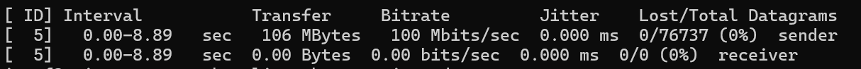 Penjelasan parameter:iperf3 -c 192.168.1.10 -u -b 100M- -u digunakan untuk mengaktifkan mode UDP.