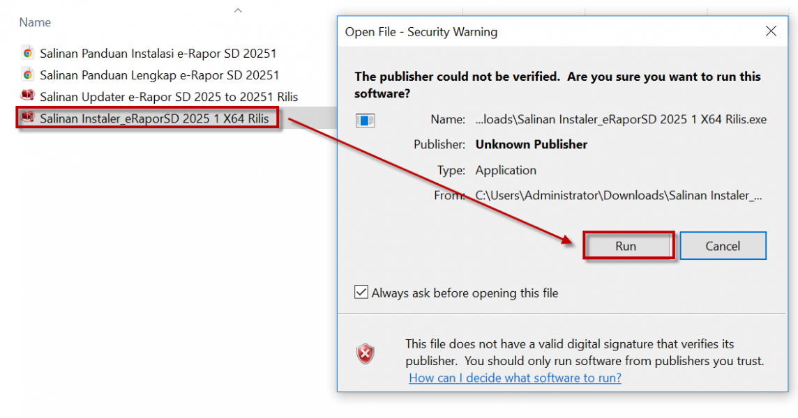 - Masuk kedalam File Exploler kemudian cari file berikut klik dua kali dan jika muncul installer berikut klik Run