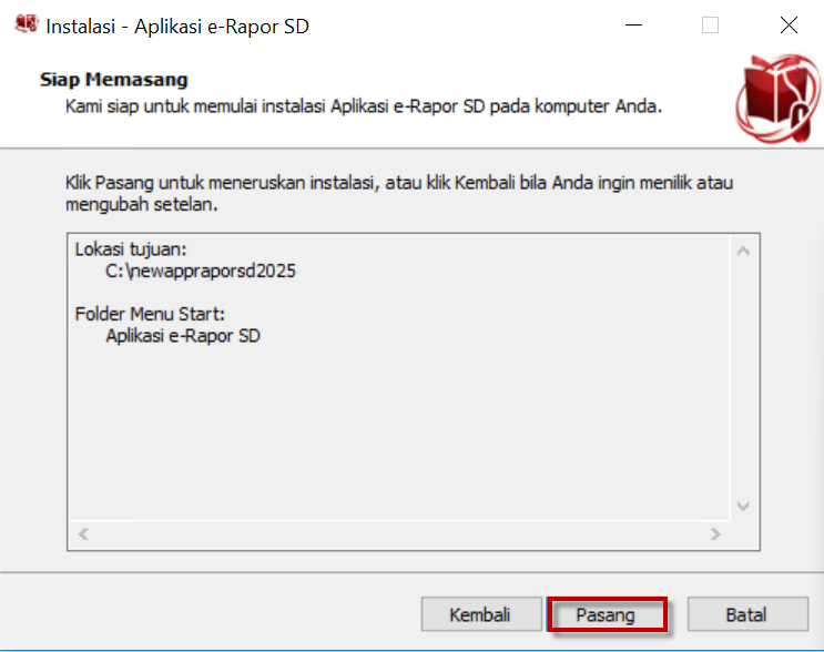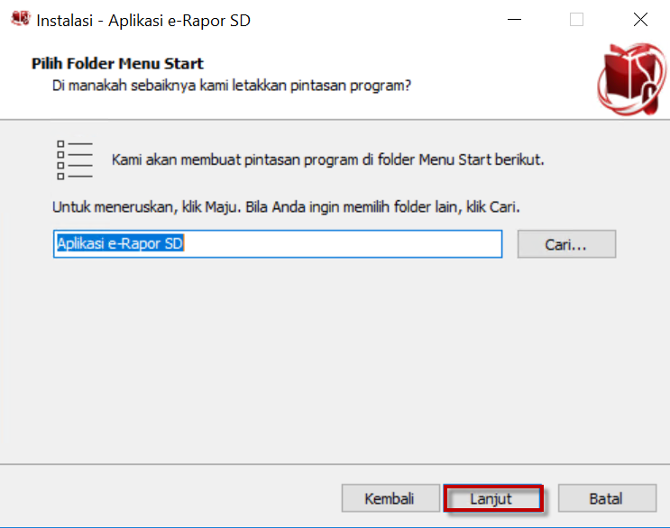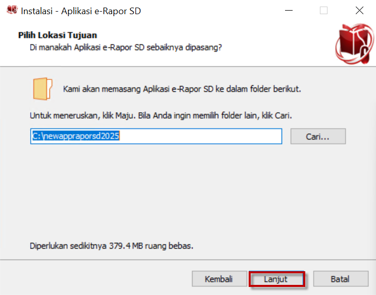 - Tentukan lokasi instalasi e-Rapor (atau biarkan default), kemudian klik Lanjut