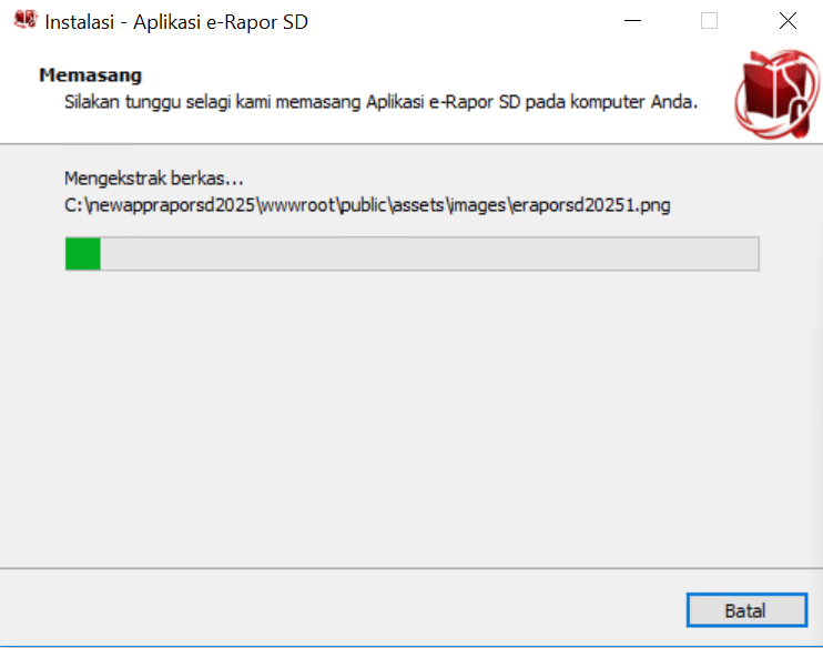 Installer e-Rapor SD 2025 (X64) wajib digunakan untuk instalasi awal, karena di dalamnya sudah termasuk aplikasi utama, web server, database, dan konfigurasi dasar sistem. Setelah instalasi awal berhasil, barulah dapat dilakukan update menggunakan Updater e-Rapor SD 2025 ke 2025.1 tanpa menghapus data yang sudah ada.