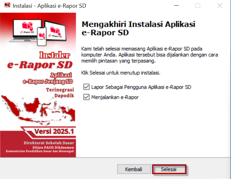 - Terakhir, klik Selesai untuk menutup installer dan menyelesaikan proses instalasi e-Rapor.