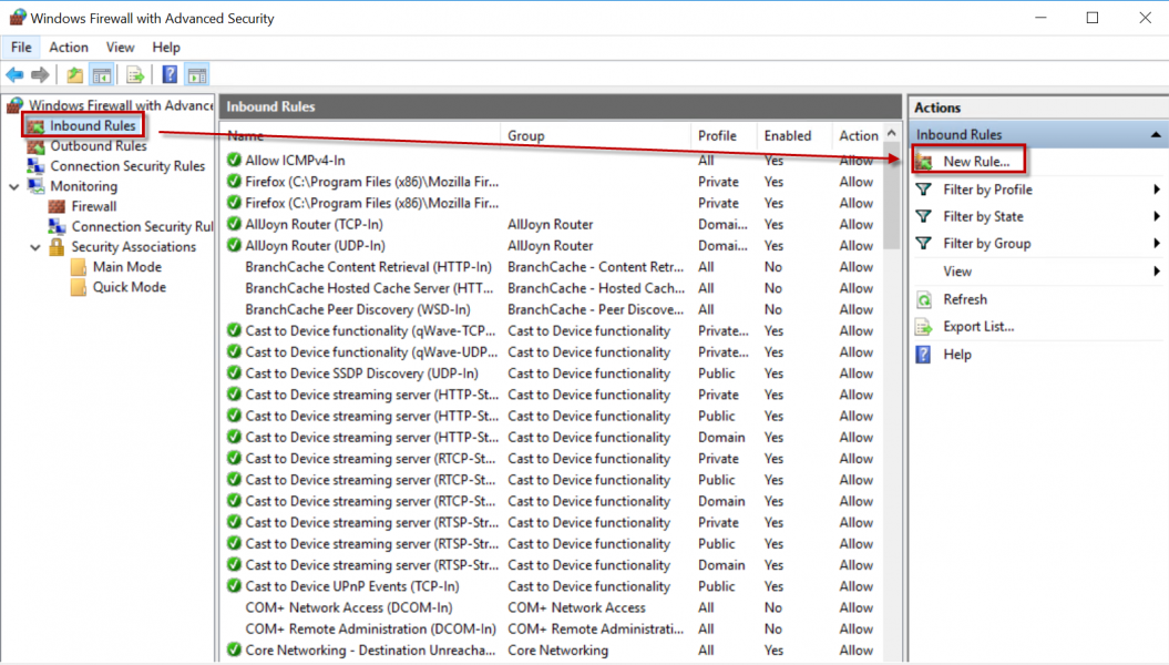 - Buka Windows Firewall with Advanced Security, lalu pilih Inbound Rules dan klik New Rule.