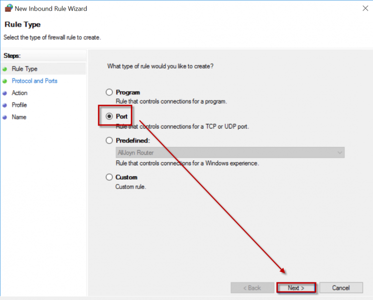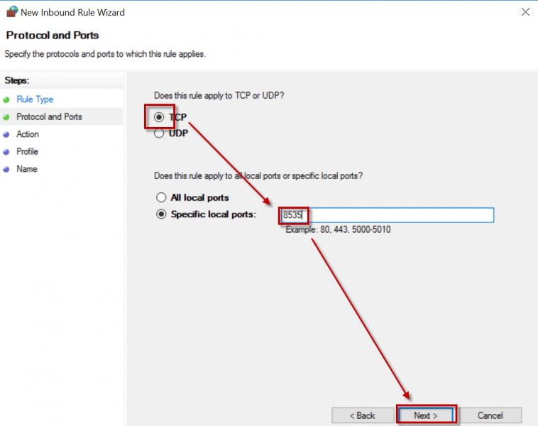 - Pilih protokol TCP, masukkan port 8535, lalu klik Next.