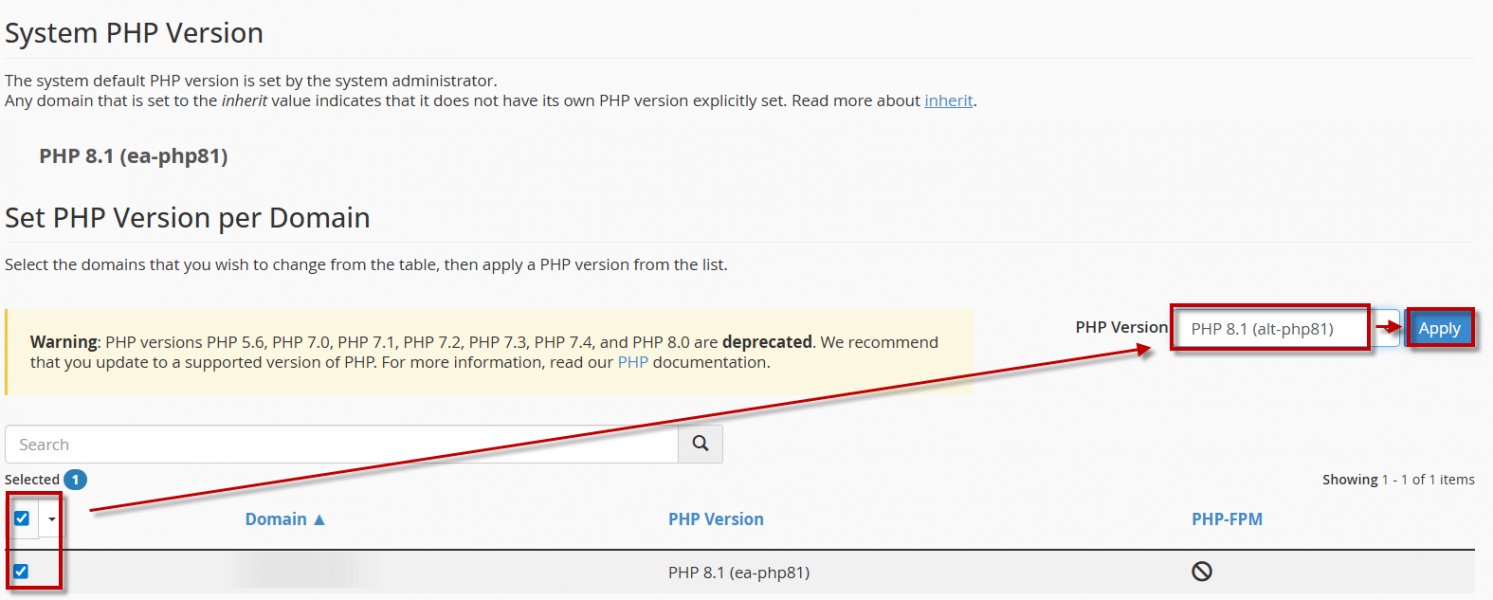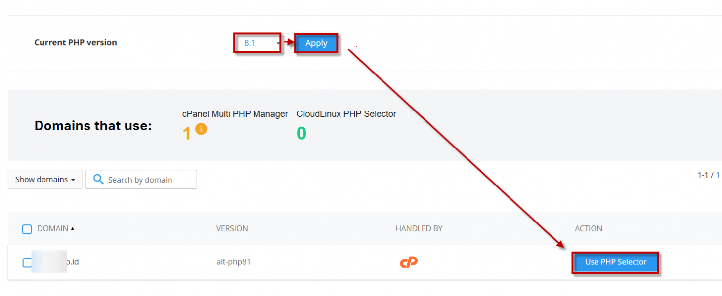 - Pilih domain yang ingin di di konfigurasikan kemudian pastikan versi php menggunakan alt bukan ea kemudian Apply.