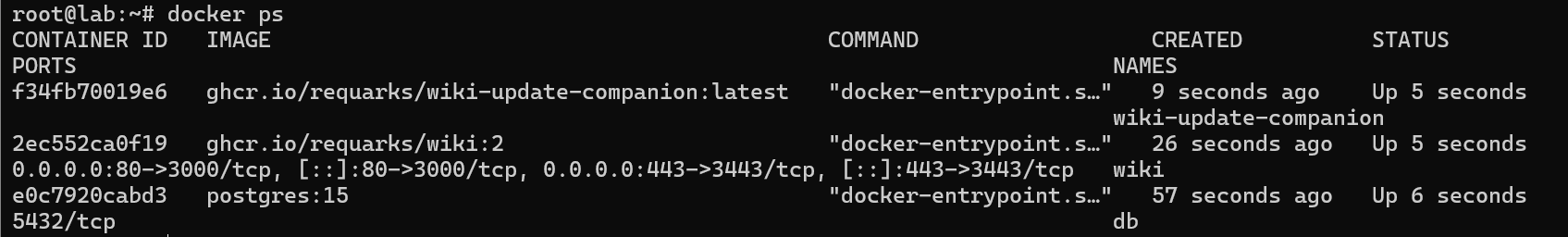 docker create \ --name=wiki-update-companion \ --network=wikinet \ --restart=unless-stopped \ -v /var/run/docker.sock:/var/run/docker.sock:ro \ ghcr.io/requarks/wiki-update-companion:latest - Jalankan Semua Container