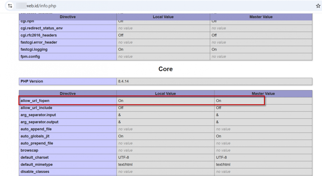 - Kemudian cek di dalam domain/php.info pastikan allow_url_fopen sudah On