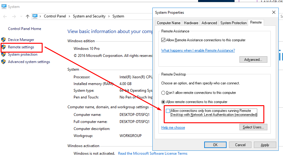 Jika anda tidak ingin melakukan setting apapun di client anda bisa melakukan uncheck pada opsi : Allow Connection only from computer running remote desktop with Network Level Authentication.