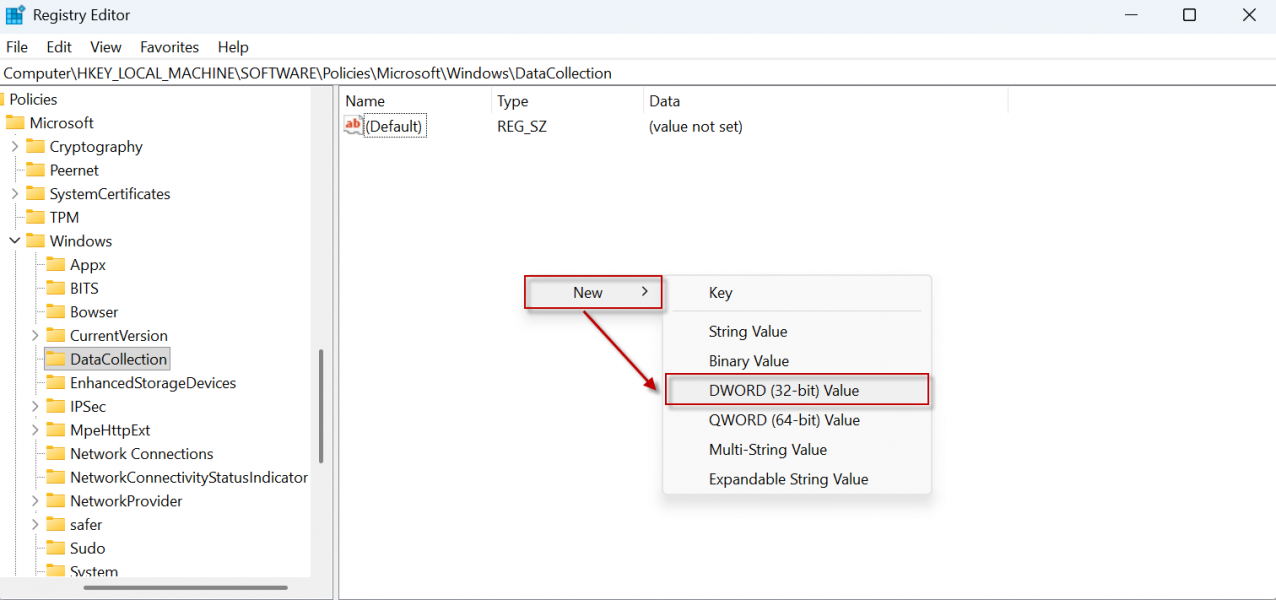 Di sisi kanan, klik kanan → New → DWORD (32-bit) Value → beri nama: AllowTelemetry