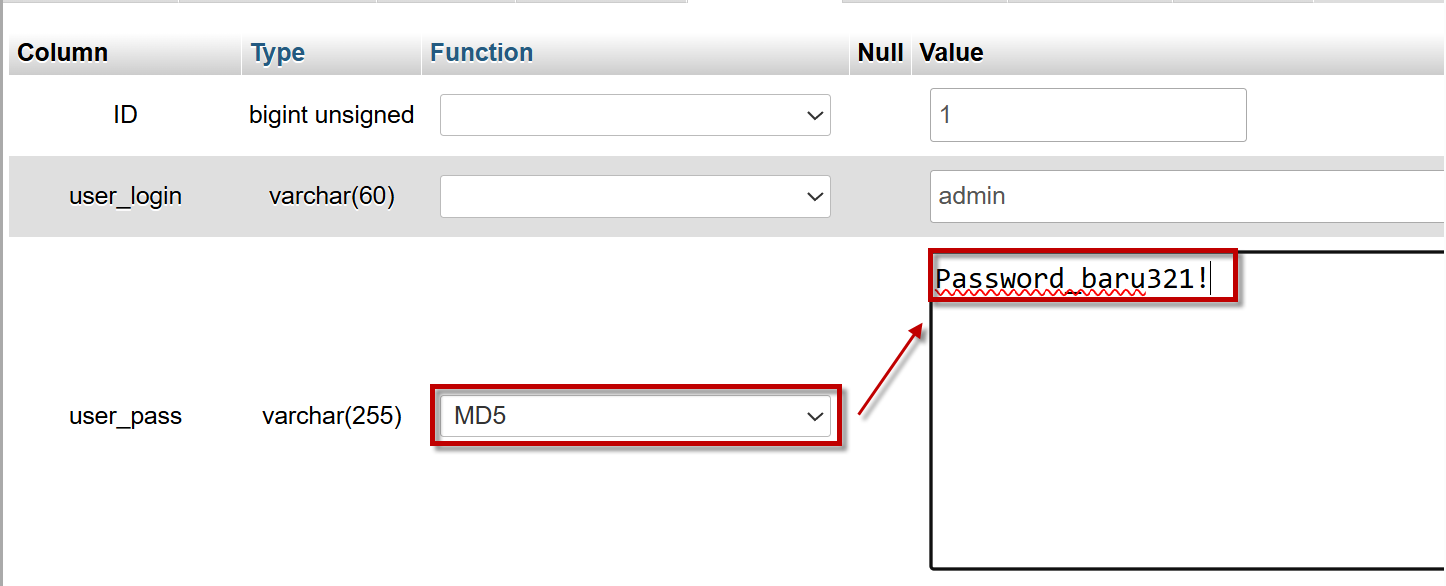 - Pada kolom user_pass:
