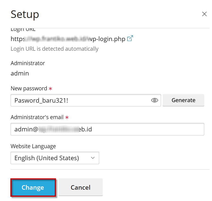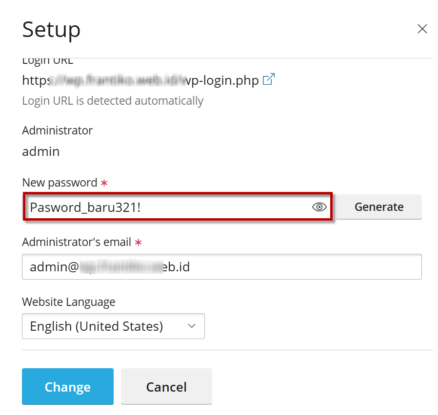 - Klik tombol Generate untuk membuat password baru secara otomatis atau isi manual sesuai kebutuhan.