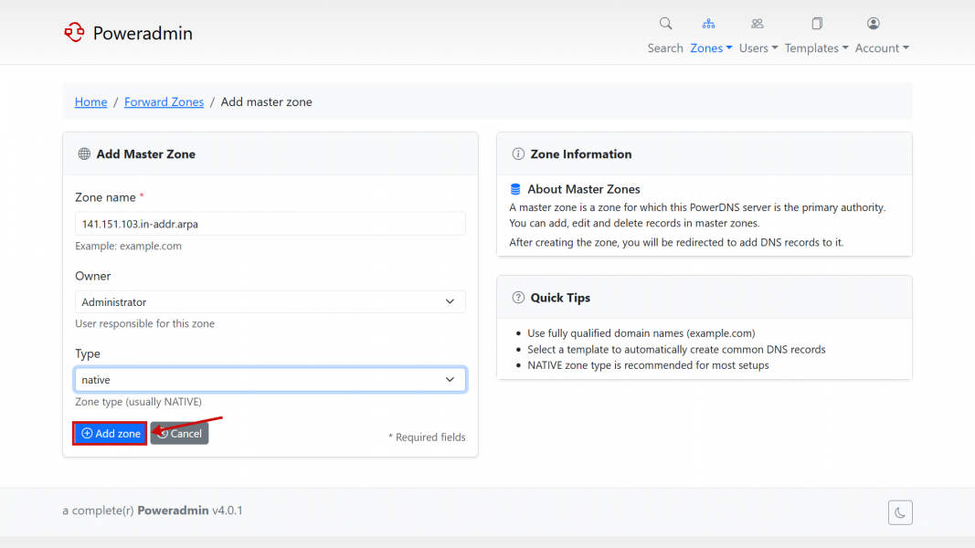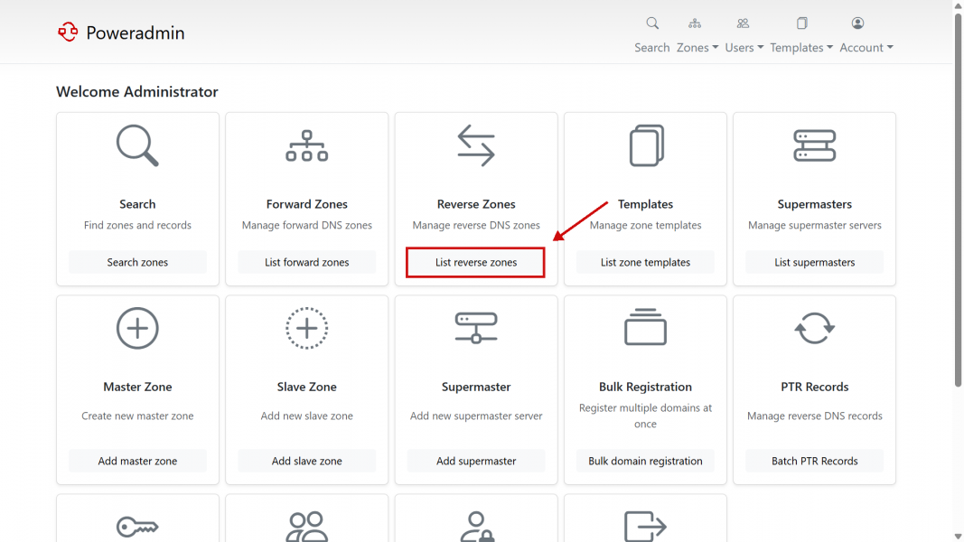 Masuk ke dashboard PowerAdmin dengan akun yang sudah dibuat sebelumnya - Masuk ke Reverse Zone