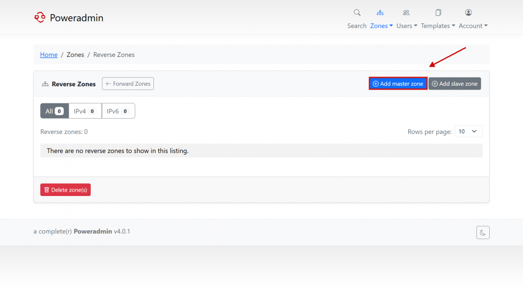 Pilih menu Zones lalu klik tab Reverse Zones. - Kemudian Pilih Add Master Zone