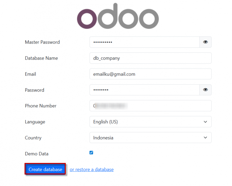 Jika dicentang, Odoo akan mengisi data contoh (cocok untuk testing & belajar). - Create Database