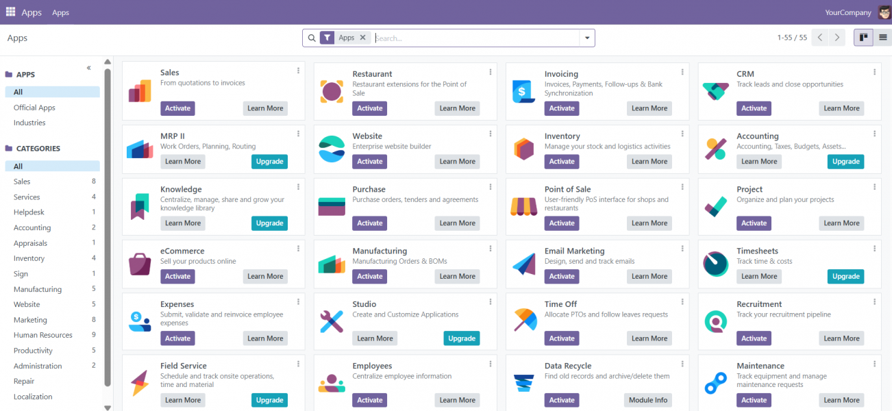 Odoo merupakan salah satu platform Enterprise Resource Planning (ERP) open source paling populer di dunia yang digunakan oleh berbagai jenis bisnis, mulai dari usaha kecil, menengah, hingga perusahaan berskala enterprise. Dengan satu sistem terintegrasi, Odoo mampu membantu pengelolaan berbagai proses bisnis seperti akuntansi, penjualan, inventaris, human resource, CRM, hingga manajemen operasional lainnya secara terpusat dan efisien. Kehadiran Odoo memudahkan perusahaan dalam mengelola data dan proses kerja tanpa harus menggunakan banyak aplikasi terpisah.