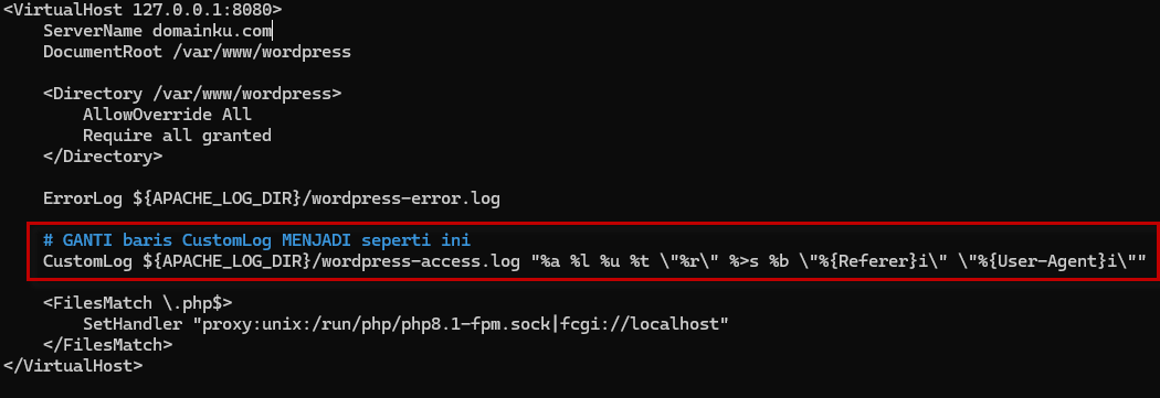 Masalah yang sering muncul: Apache tidak mengetahui IP asli pengunjung. Semua request terlihat berasal dari 127.0.0.1 (IP lokal Nginx), sehingga log Apache tidak akurat dan fitur keamanan WordPress bisa salah membaca aktivitas user.