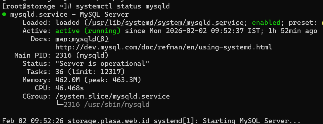 sudo systemctl start mysqld - Pastikan MySQL berjalan normal: