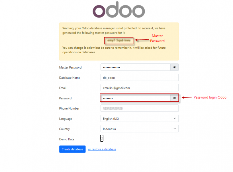 Merupakan password utama database Odoo. Password ini digunakan untuk melakukan tindakan administratif seperti backup dan restore database. Pastikan Anda menyimpan master password ini dengan aman karena sangat penting untuk pengelolaan database. - Database Name