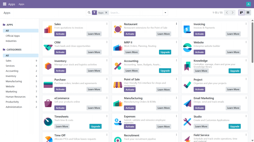 Setelah berhasil login, Anda akan diarahkan ke dashboard Odoo. Pada halaman ini, Odoo menampilkan daftar aplikasi (Apps) yang tersedia dan siap digunakan.