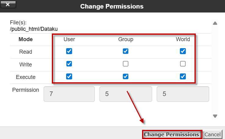 - Akan muncul kotak berisi centang untuk Read, Write, dan Execute untuk User, Group, dan World.