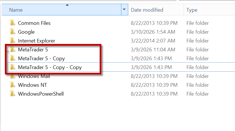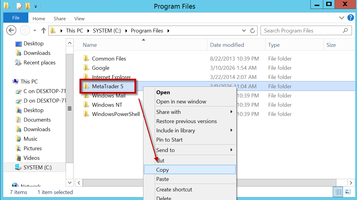 - Cari folder MetaTrader 5 kemudian klik Copy