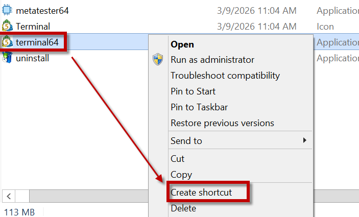 - Klik kanan terminal64.exe, kemudian pilih Create Shortcut