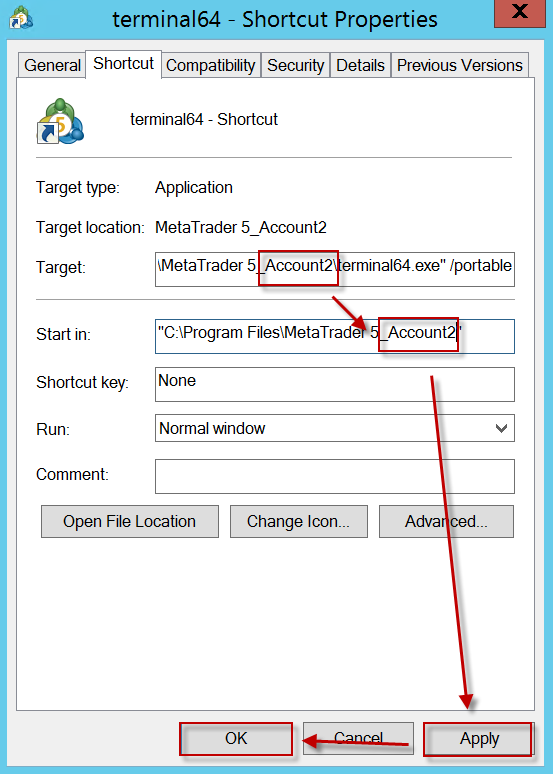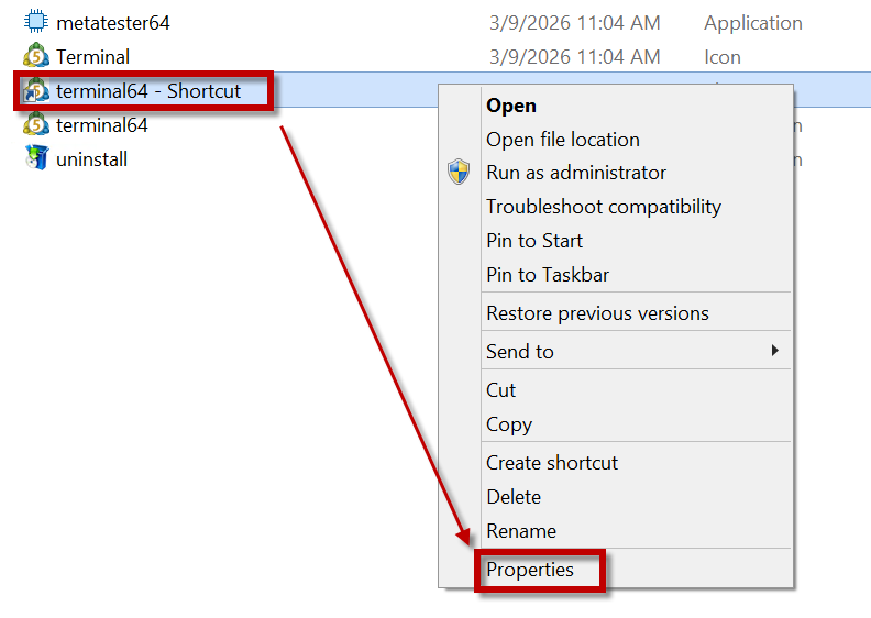 - Masuk ke dalam MetaTrader 5_Account2, klik kanan terminal64 shortcut kemudian klik Properties