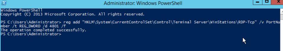 reg add "HKLM\System\CurrentControlSet\Control\Terminal Server\WinStations\RDP-Tcp" /v PortNumber /t REG_DWORD /d 4801 /f