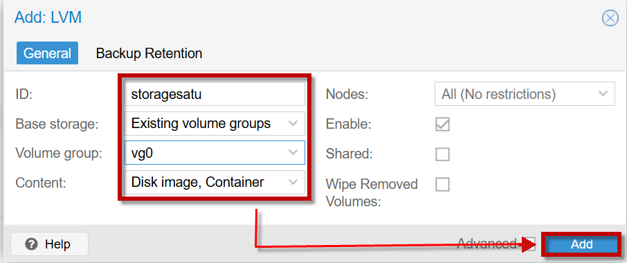 Nama identifikasi storage yang akan muncul di GUI Proxmox. - Volume group: pilih vg0