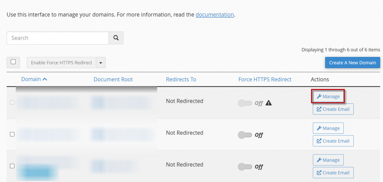 - Pilih domain yang ingin dihapus kemudian klik Manage.