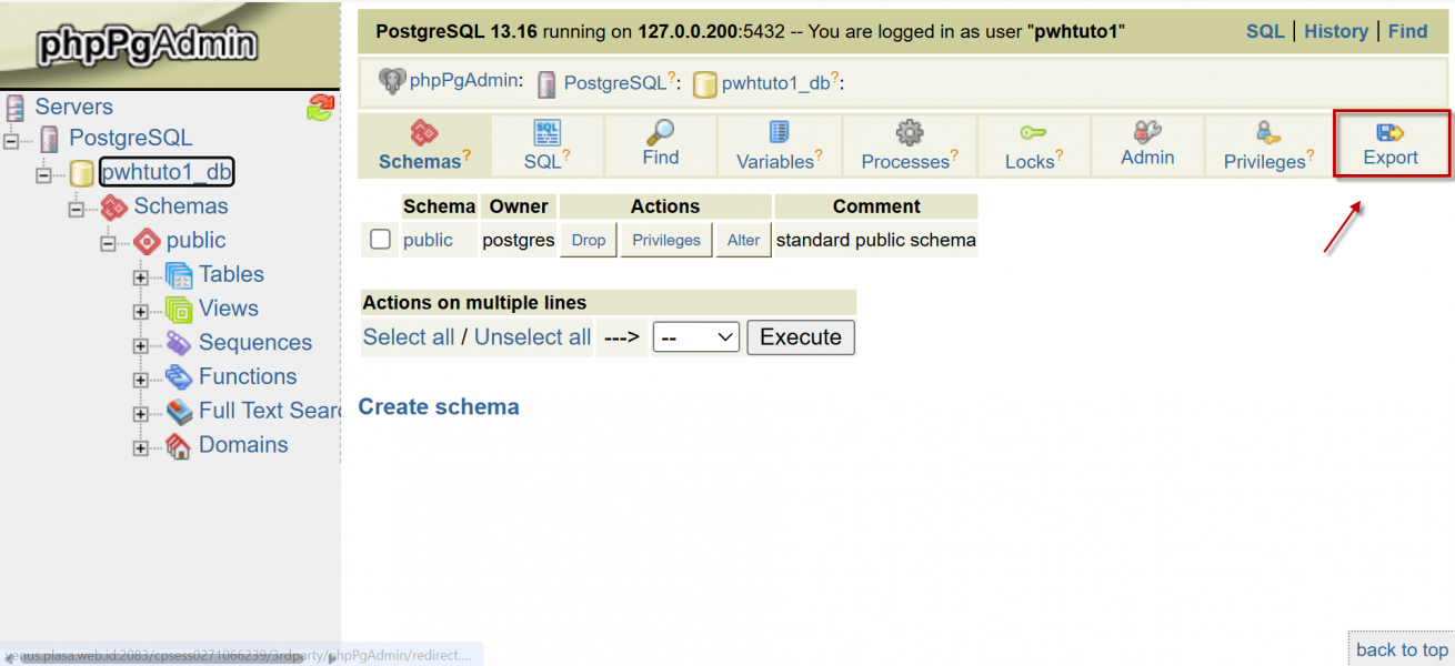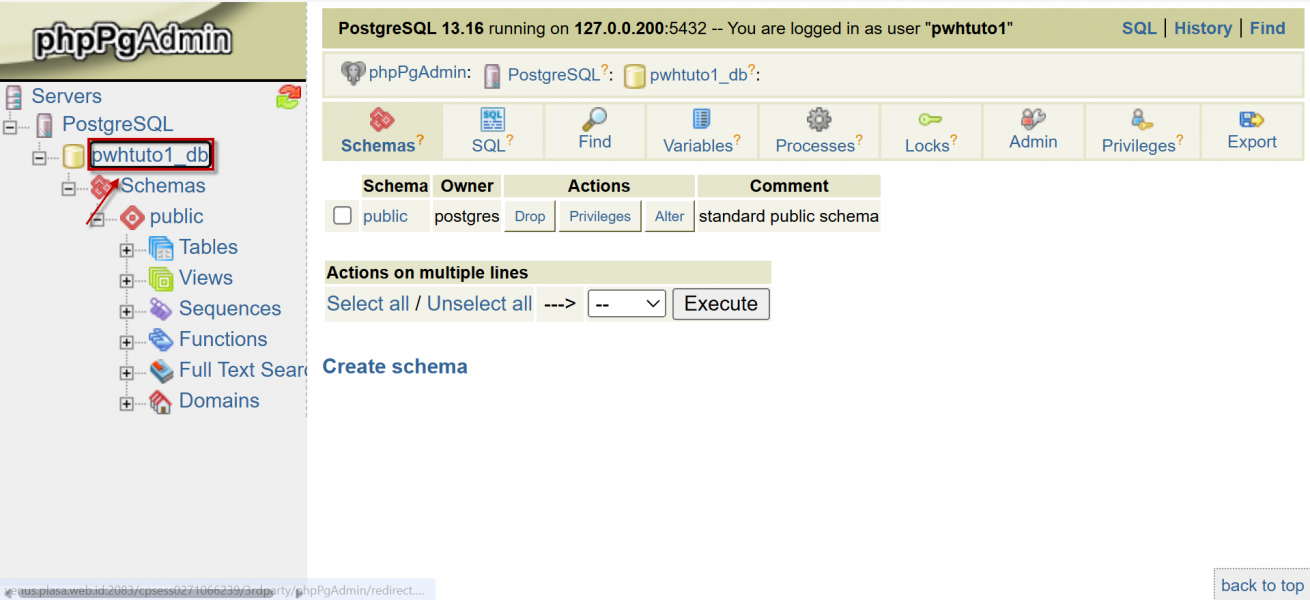 Di panel kiri phpPgAdmin, perluas server hingga menemukan nama database Anda. Klik nama database tersebut untuk membukanya.