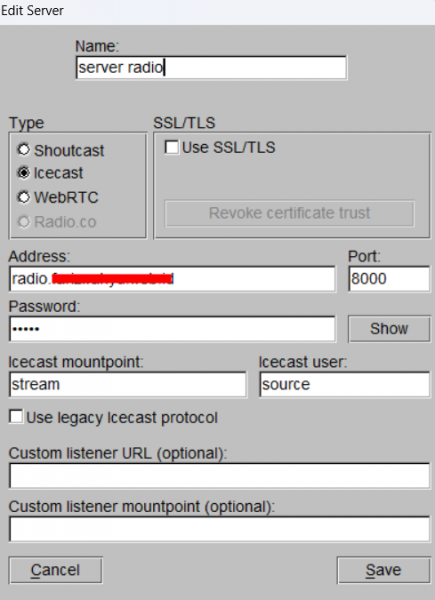 - Address: IP server atau domain Anda (contoh: 123.45.67.89 atau radio.domain.com).