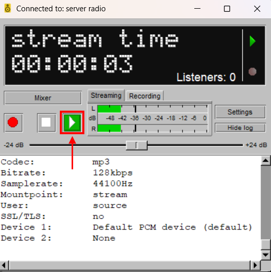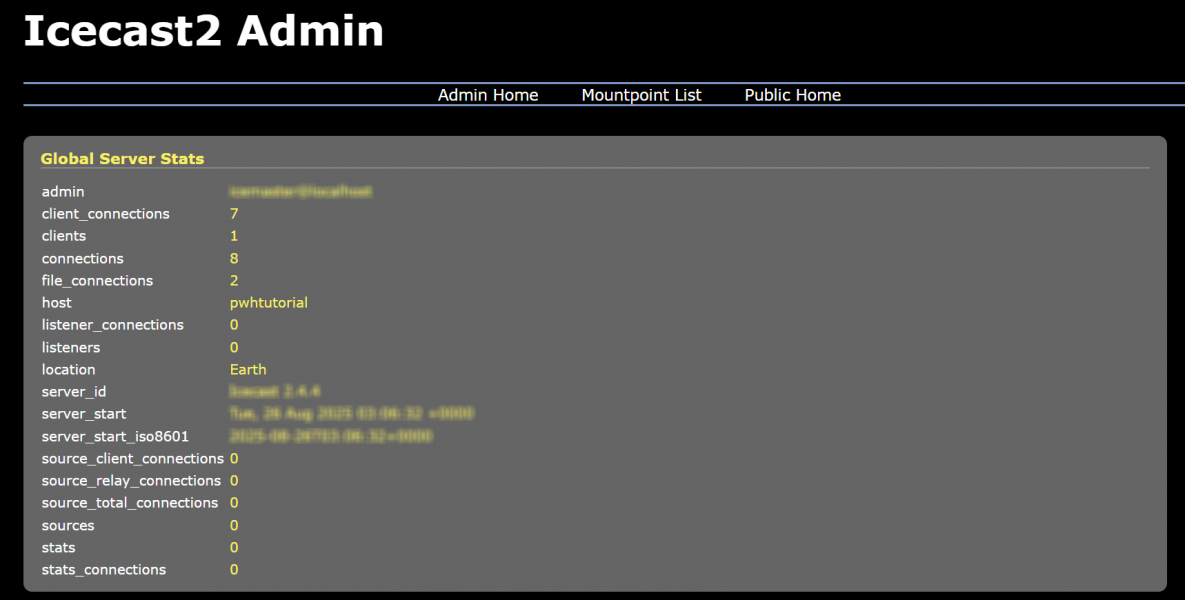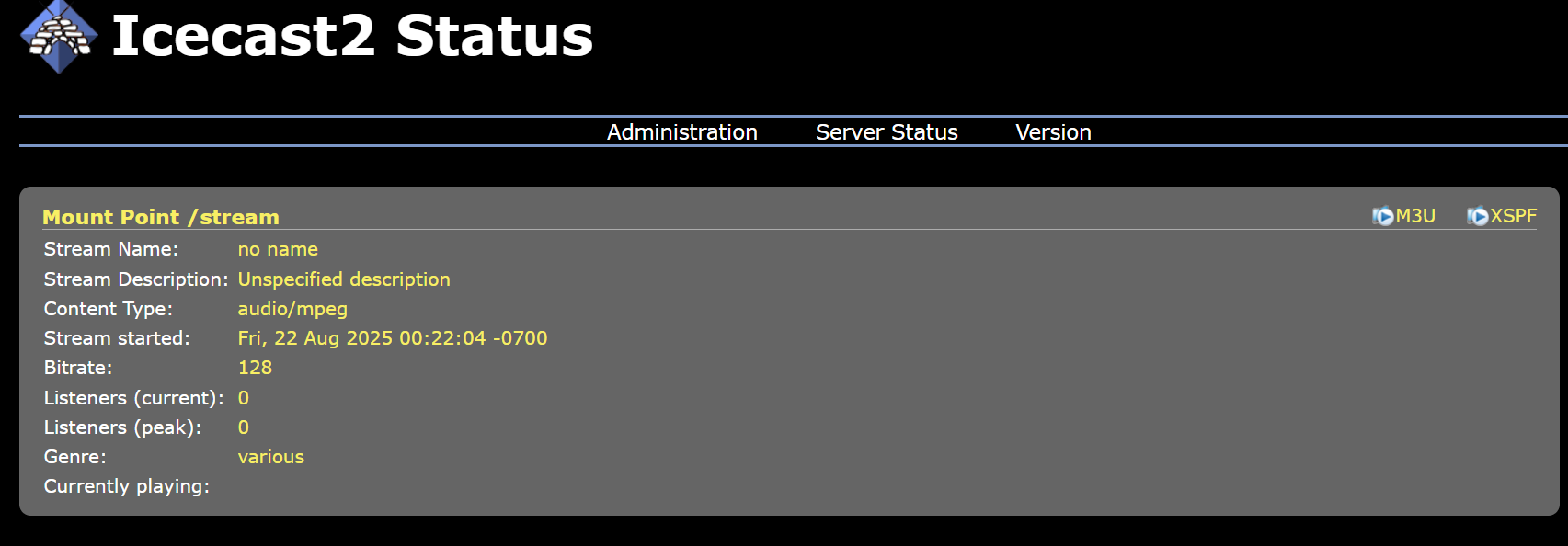 - Port: default 8000 (atau sesuai yang Anda set di icecast.xml).