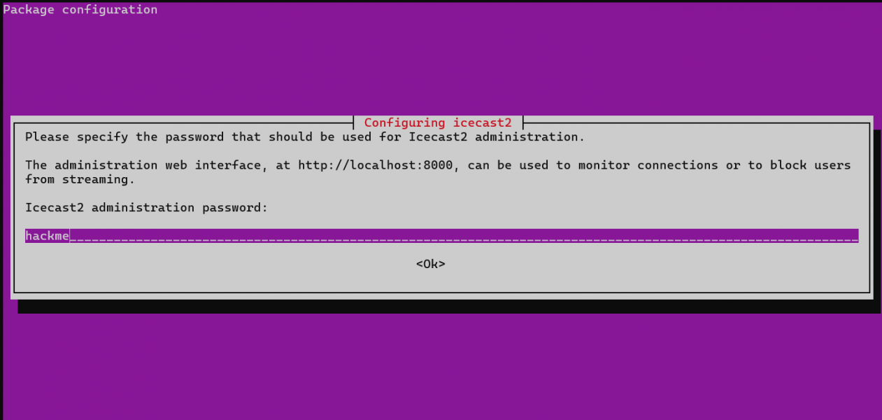 Jika Anda melewatkan konfigurasi, tidak masalah. Semua pengaturan dapat dilakukan melalui file konfigurasi di /etc/icecast2/icecast.xml.