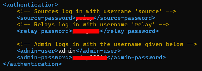 - Password untuk admin, relay, dan source: buat password yang kuat.