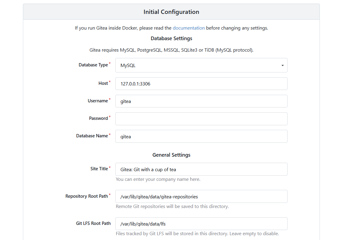 CREATE DATABASE gitea; CREATE USER 'gitea'@'localhost' IDENTIFIED BY 'passwordku'; GRANT ALL PRIVILEGES ON gitea.* TO 'gitea'@'localhost'; FLUSH PRIVILEGES; EXIT;Catatan: Ganti passwordku dengan password yang kuat