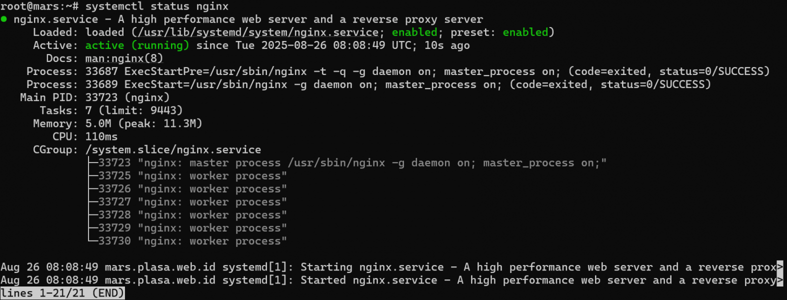 Pastikan statusnya active (running).Systemctl status nginx