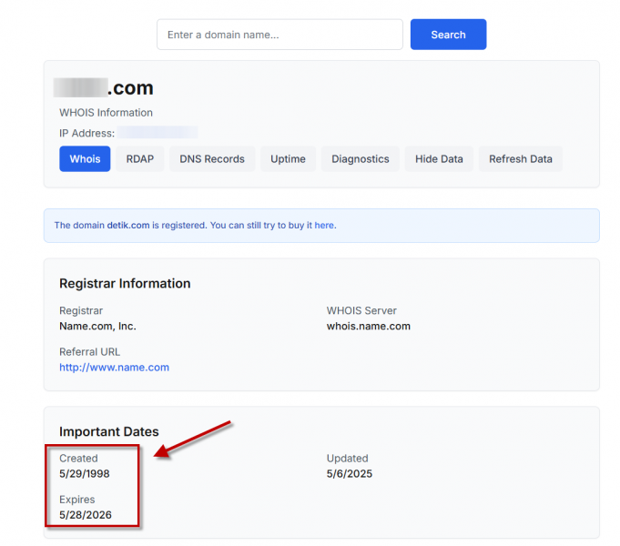 Beberapa domain menggunakan layanan privasi WHOIS sehingga data pemilik disamarkan tetapi tanggal expires biasanya tetap terlihat.