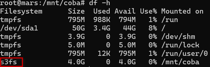 - jalankan perintah berikut untuk menampilkan mount s3fs: