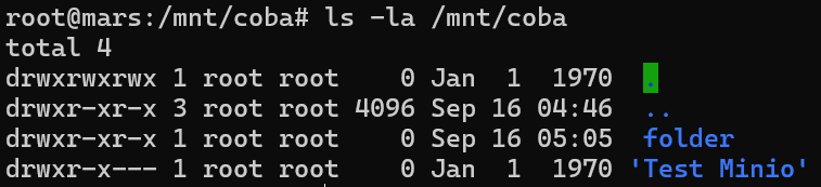 Jalakan perintah berikut untuk mengecek apakah folder dalam bucket sudah muncul di disk local linux kita :