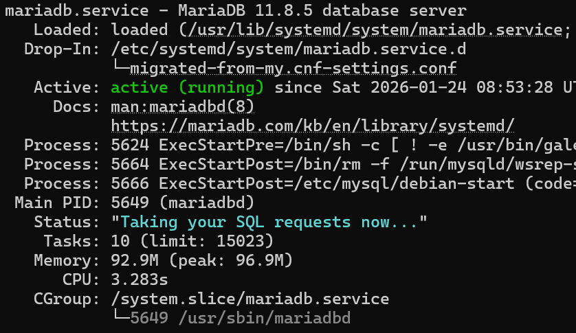 MariaDB [(none)]> SELECT VERSION(); +------------------------+ | VERSION() | +------------------------+ | 11.8.5-MariaDB-ubu2404 | +------------------------+ 1 row in set (0.000 sec) - Mengecek status service MariaDB