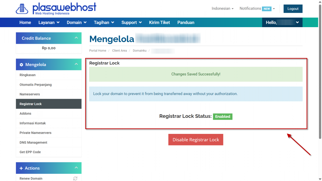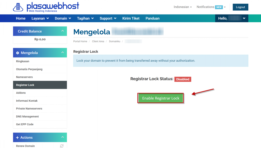 Cara setting Lock atau Unlock Domain di Plasawebhost