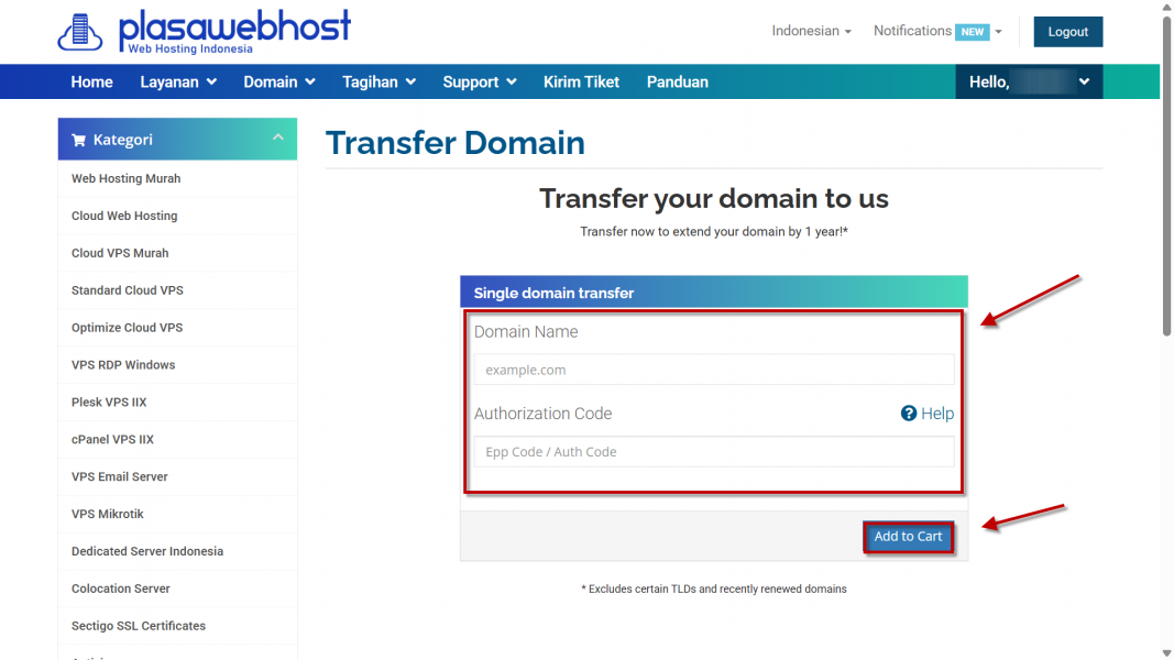 - Masukkan nama domain yang ingin ditransfer (contoh: namadomain.com).