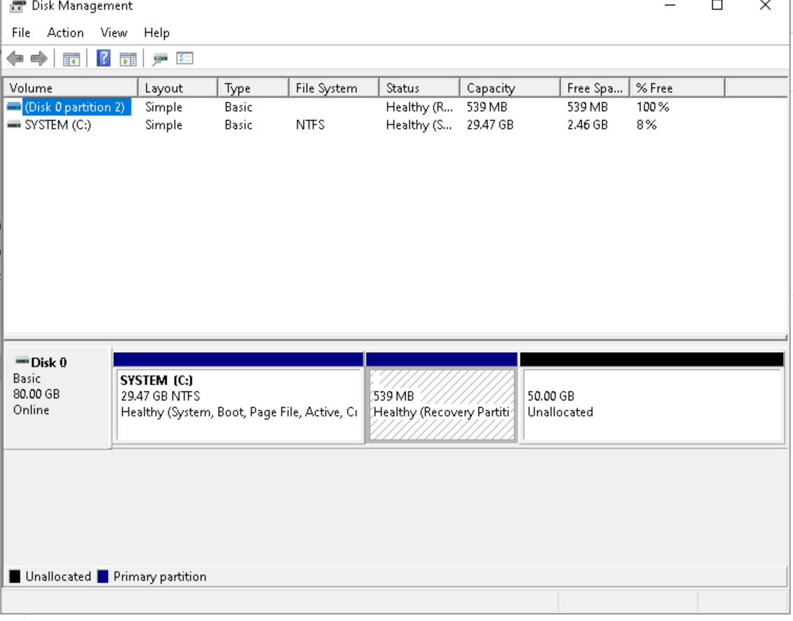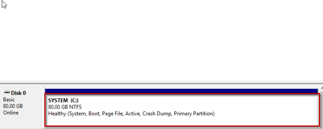Disk ### Status Size Free -------- -------- ------ ------ Disk 0 Online 80 GB 50 GB -