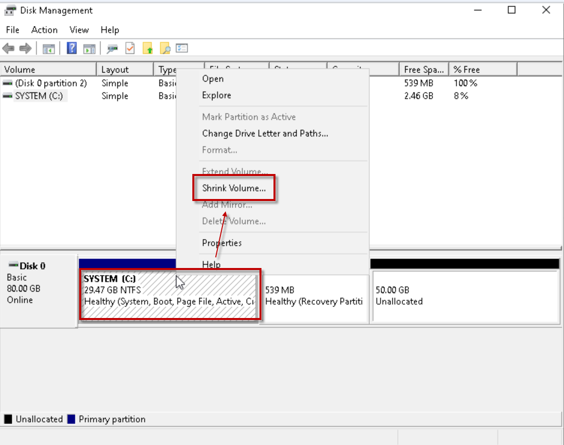 Kemudian cari Disk Management - Kemudian pada System C klik kanan kemudian Shrink Volume